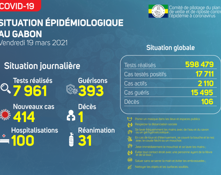Sur le plan épidémiologique, nous avons enregistré 414 nouveaux cas positifs sur 7 961 tests réalisés, soit un taux de positivité de 5,2%, 100 personnes hospitalisées dont 31 en réanimation pour détresse respiratoire, 393 guérisons et 01 nouveau décès notifié à Port-Gentil.