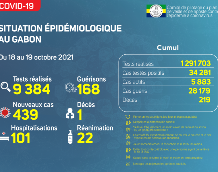 Gabon Matin vous livre le point journalier du Comité de pilotage du plan de veille et de riposte contre l’épidémie à Coronavirus au Gabon du 19 octobre 2021.