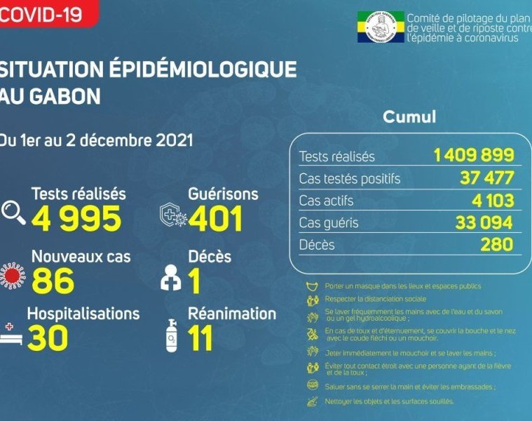 Gabon Matin vous livre le point journalier du Comité de pilotage du plan de veille et de riposte contre l’épidémie à Coronavirus au Gabon du 2 décembre 2021.