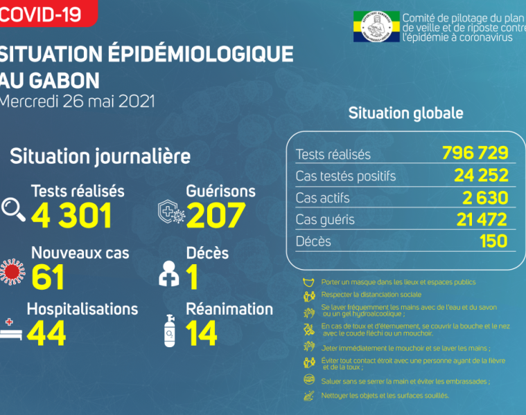 Gabon Matin vous livre le point journalier du Comité de pilotage du plan de veille et de riposte contre l’épidémie à Coronavirus au Gabon du 26 mai 2021.