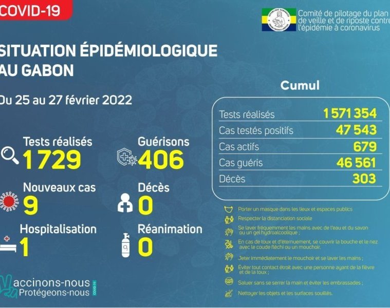 GabonMatin vous livre le point journalier du Comité de pilotage du plan de veille et de riposte contre l’épidémie à Coronavirus au Gabon du 27 février 2022.