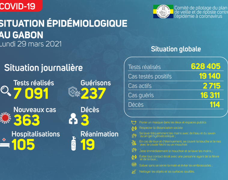 Nous avons enregistré 363 nouveaux cas positifs sur 7 091 tests réalisés, soit un taux de positivité de 5%, 105 personnes hospitalisées dont 19 en réanimation pour détresse respiratoire, 237 guérisons et 03 nouveaux décès notifiés à Libreville.