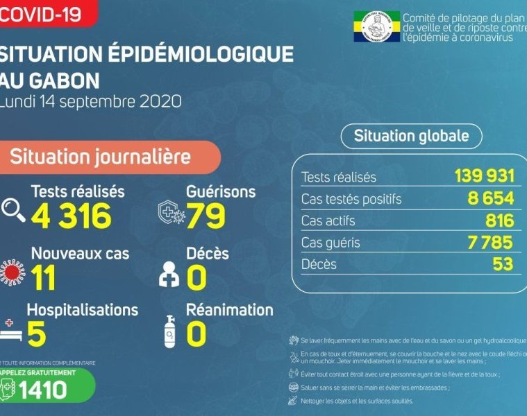 Gabon Matin vous livre le point journalier du Comité de pilotage du plan de veille et de riposte contre l’épidémie à Coronavirus au Gabon du 14 septembre 2020.
