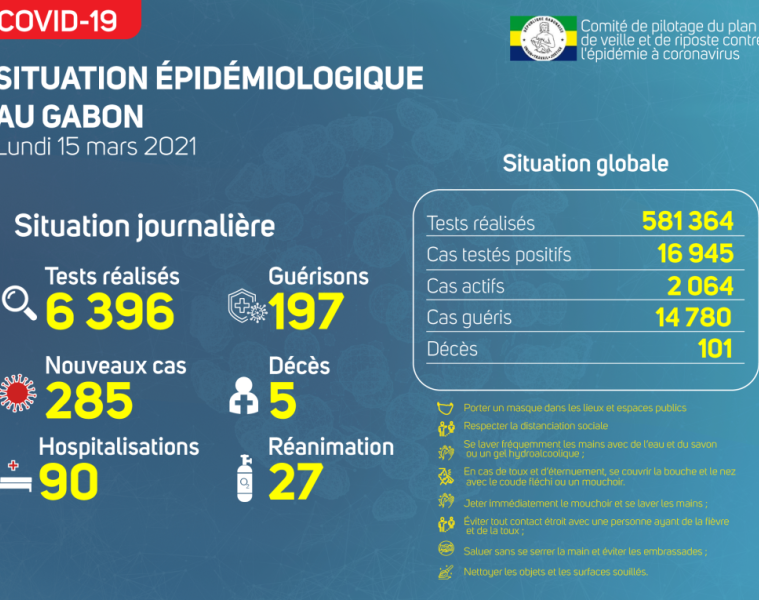 Sur le plan épidémiologique, nous avons enregistré 285 nouveaux cas positifs sur 6 396 tests réalisés, soit un taux de positivité de 4,4%, 90 personnes hospitalisées dont 27 en réanimation pour détresse respiratoire, 197 guérisons et 05 nouveaux décès notifiés à Libreville.