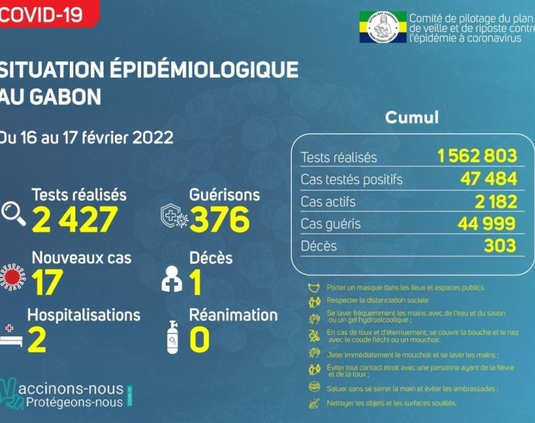 GabonMatin vous livre le point journalier du Comité de pilotage du plan de veille et de riposte contre l’épidémie à Coronavirus au Gabon du 17 février 2022.