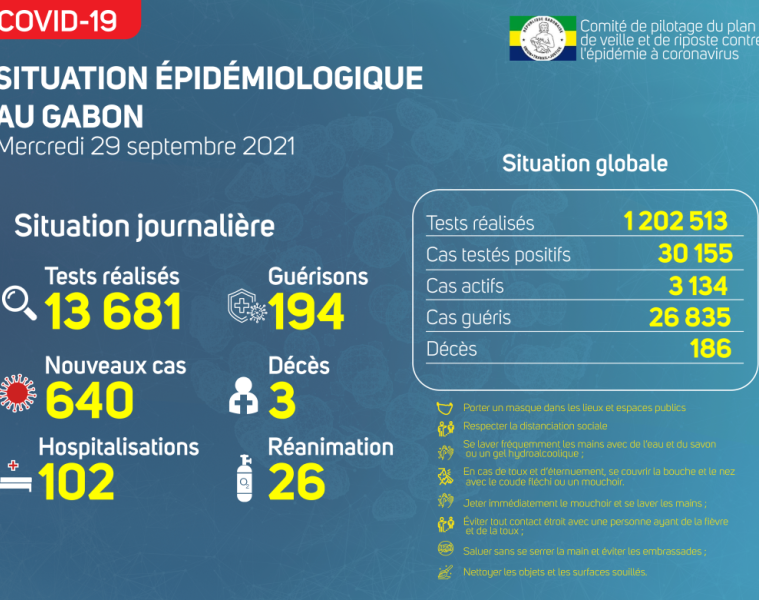 Nous avons enregistré 640 nouveaux cas positifs sur 13 681 tests réalisés, soit un taux de positivité de 4.7%, 102 personnes hospitalisées dont 26 en réanimation pour détresse respiratoire, 194 nouvelles guérisons et 03 nouveaux décès dont 02 à Libreville et 01 à Oyem.