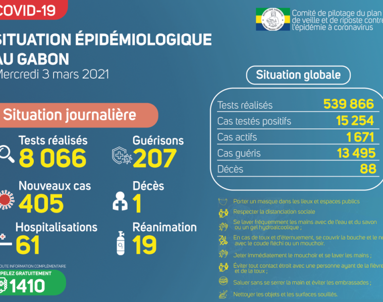 Nous avons enregistré 405 nouveaux cas positifs sur 8 066 prélèvements, soit un taux de positivité de 5%. Le nombre de personnes hospitalisées est de 61 dont 19 en réanimation pour détresse respiratoire et nous avons enregistré 01 nouveau décès à Libreville. Le nombre de guérisons est de 207 et le nombre de cas actifs 1 671.