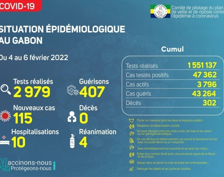 GabonMatin vous livre le point journalier du Comité de pilotage du plan de veille et de riposte contre l’épidémie à Coronavirus au Gabon du 6 février 2022.