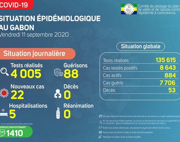 Gabon Matin vous livre le point journalier du Comité de pilotage du plan de veille et de riposte contre l’épidémie à Coronavirus au Gabon du 11 septembre 2020.