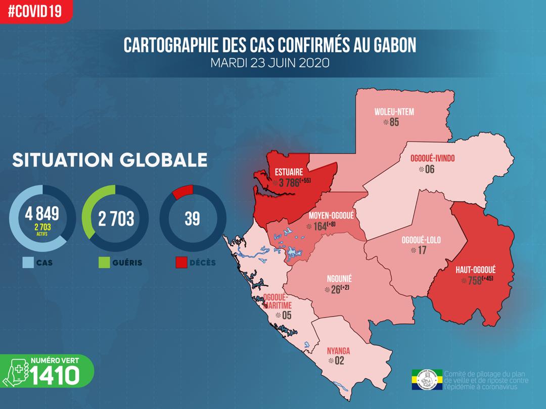 - Estuaire : 55 nouveaux cas sur 700 prélèvements à Libreville, soit 3 786 cas positifs ;
